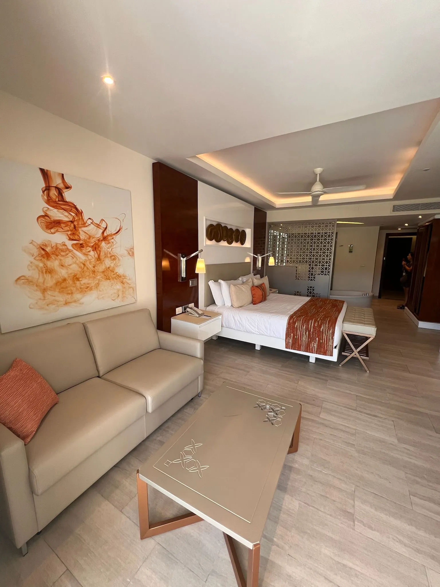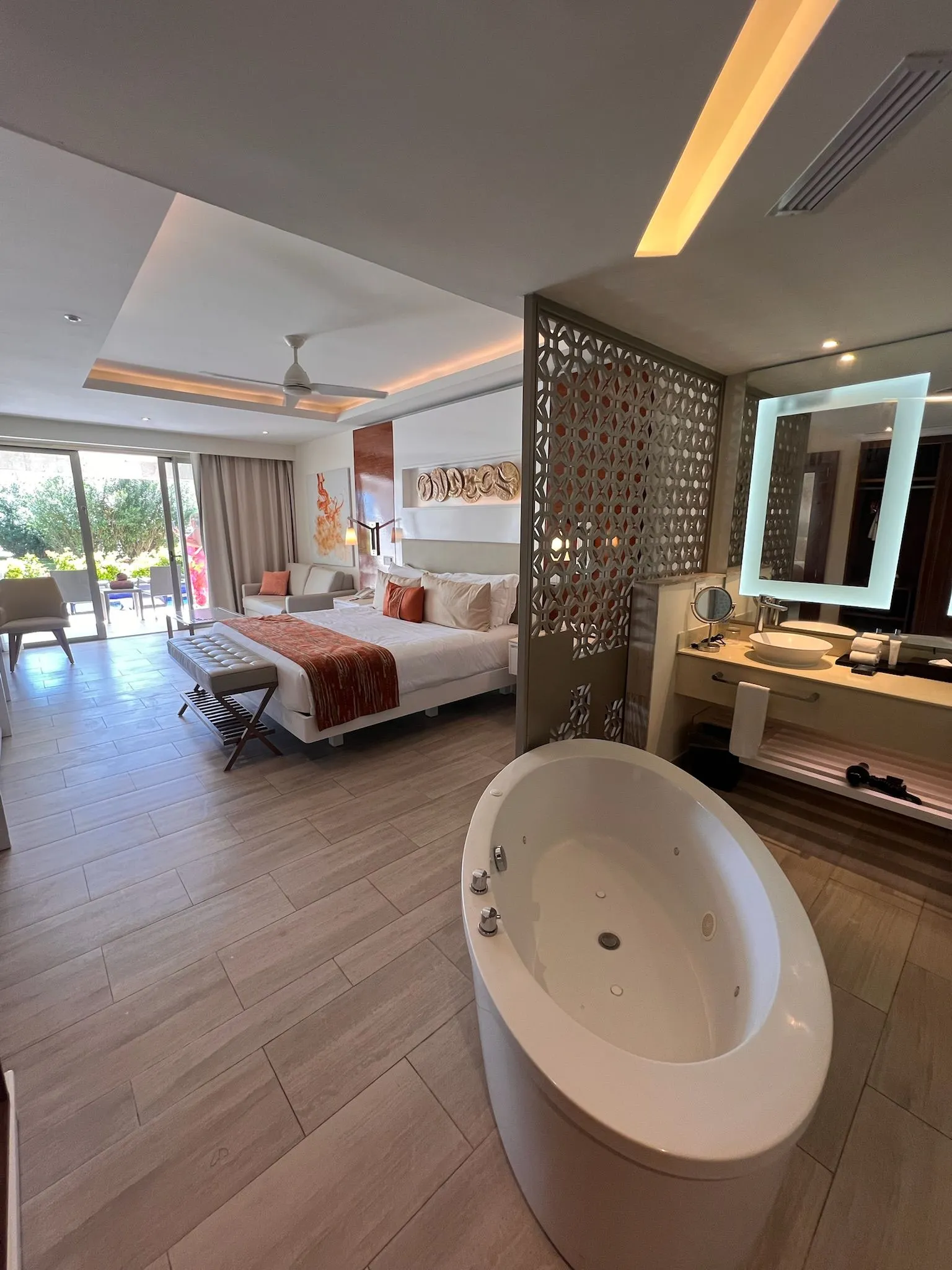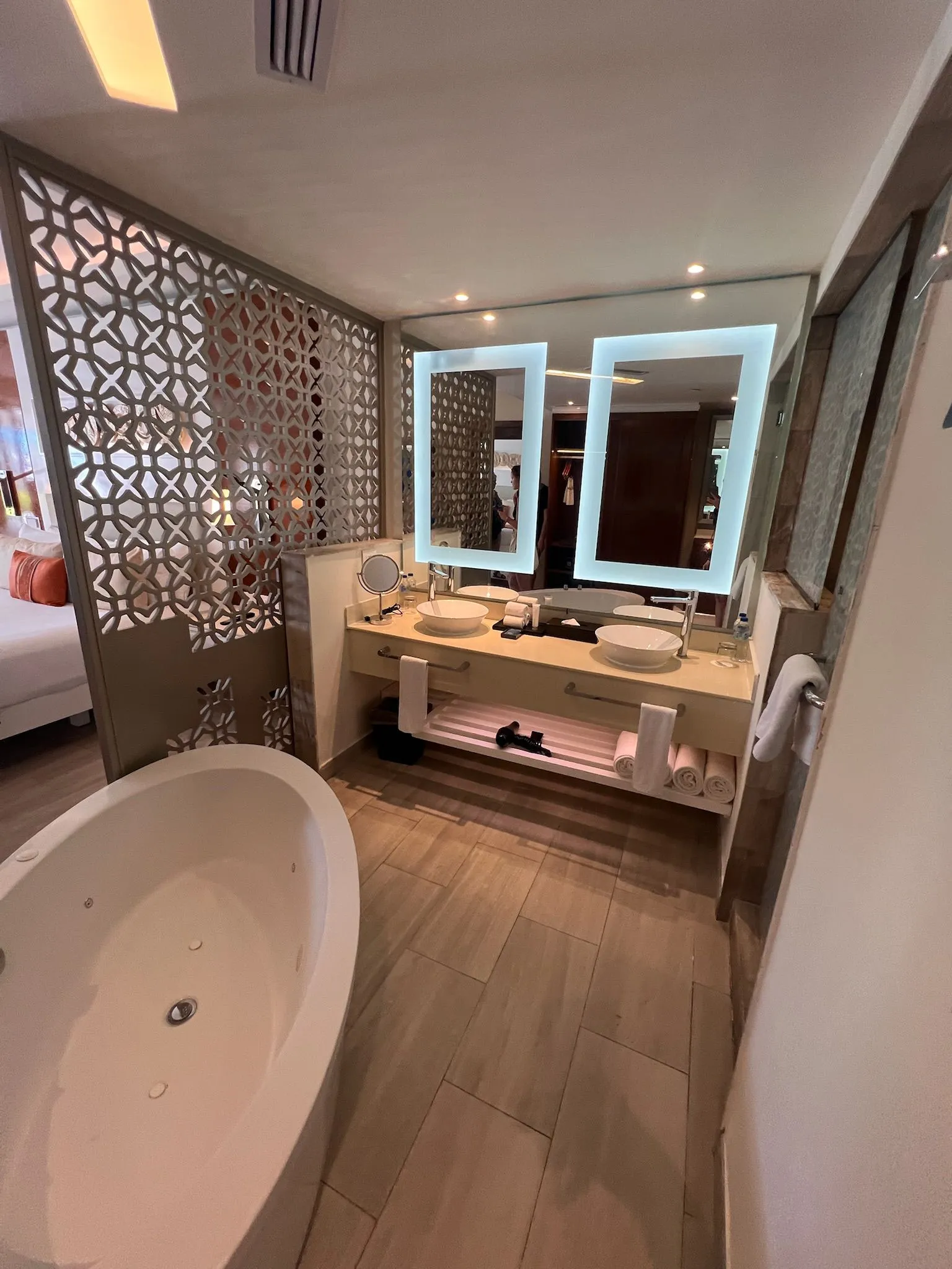 Diamond Club to wersja premium pobytu: osobny check-in, usługa butlera, lepsze wyposażenie pokoju oraz dodatkowe udogodnienia. Warto rozważyć dla większej wygody. Jeśli chodzi o pokoje, duże wrażenie robi Swim-Out Room, z bezpośrednim wyjściem do basenu. Każdy pokój ma codziennie uzupełniany minibar, room service, wybór poduszek, a nawet parownicę do ubrań. Aż ok. 80% pokoi można łączyć w tzw. connecting rooms, co jest ogromną zaletą dla rodzin lub większych grup. Główna strefa basenowa jest naprawdę imponująca: wiele basenów, jacuzzi, mnóstwo leżaków i kabany – miejsca nie brakuje nawet w bardziej obleganych godzinach. Plaża natomiast jest bardzo czysta, szeroka i z piękną lazurową wodą, choć trzeba pamiętać, że praktycznie brakuje tam palm – cień zapewniają głównie parasole.